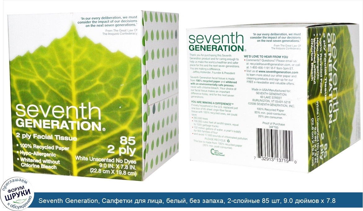 Друзья, если у вас есть отзыв/дополнение/комментарий/вопрос относительно Seventh Generation, Салфетки для лица, белый, без запаха, 2-слойные 85 шт, 9.0 дюймов x 7.8 дюймов - напишите его ответом в эту тему (это будет полезно всему сообществу в целом и вам в отдельности).