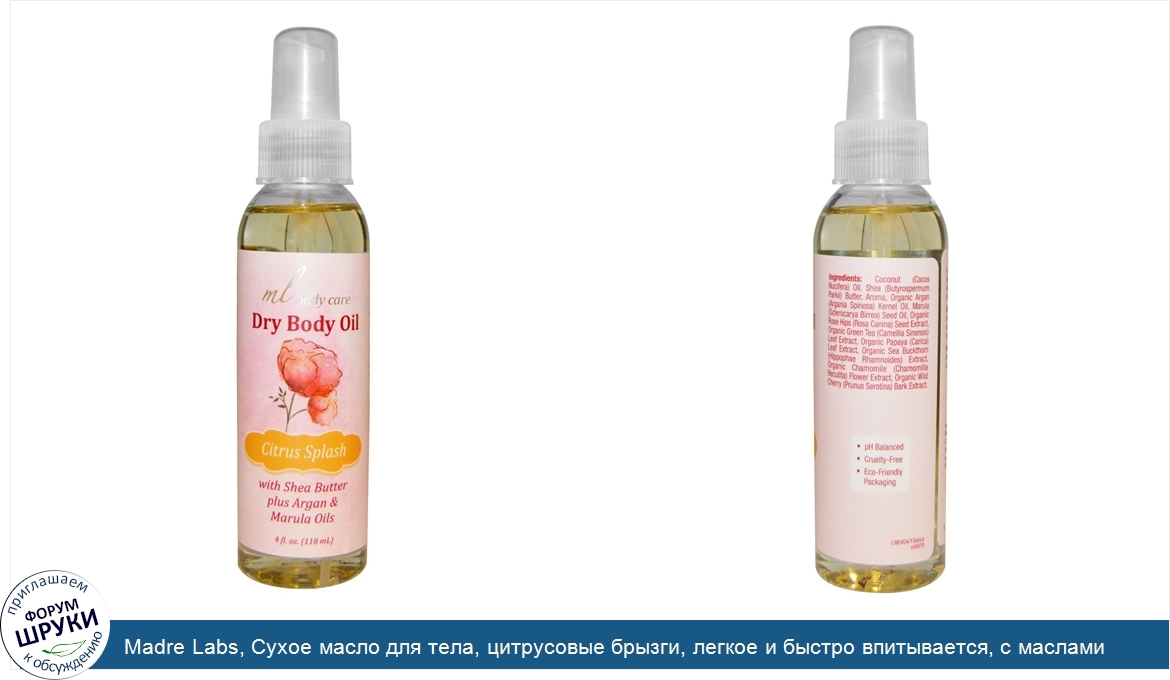 Друзья, если у вас есть отзыв/дополнение/комментарий/вопрос относительно Madre Labs, Сухое масло для тела, цитрусовые брызги, легкое и быстро впитывается, с маслами арганы и марулы + масло ши, 4жидких унции (118мл) - напишите его ответом в эту тему (это будет полезно всему сообществу в целом и вам в отдельности).