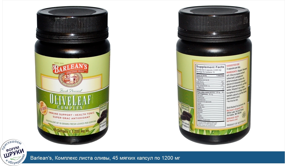 Друзья, если у вас есть отзыв/дополнение/комментарий/вопрос относительно Barlean's, Комплекс листа оливы, 45 мягких капсул по 1200 мг - напишите его ответом в эту тему (это будет полезно всему сообществу в целом и вам в отдельности).