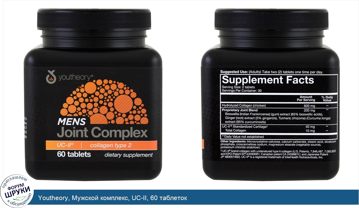 [DESCRIPT]Collagen Type 2. Dietary Supplement. Supports Joint Function. Improves Knee Joint Flexibility. Helps Alleviate Joint Pain Associated with Strenuous Exercise. Age Strong. Youtheory Mens Joint Complex is an advanced men's health formula that blends botanical extract with bioactive collagen peptides. At its core is UC-II: a patented type 2 collagen complex that is clinically-studied for its powerful joint benefits. A small but effective dose of UC-II can help men maintain an active and healthy lifestyle.[/DESCRIPT]... (описание дополняется)
