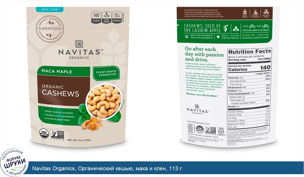 [DESCRIPT]140 калорий. Растительный протеин. 15% суточной нормы магния в каждой 28-граммовой порции. Сладкий кленовый кешью. Очень полезный. Без глютена и молочных продуктов. Органическое происхождение подтверждено Министерством сельского хозяйства США. Подтверждено отсутствие ГМО. Античное сокровище. Без искусственных красителей и вкусовых добавок. Сытные закуски для еды на ходу. Без искусственных красителей и ароматизаторов. Navitas. Жизнь с позитивом. Сертифицировано B Corporation. Отсутствие глютена сертифицировано. Веганский продукт. Не содержит бисфенола-А. Суперпродукт. Высшего качества. На растительной основе. Высокое содержание незаменимых питательных веществ. Обещание суперпродуктов:. Мы используем самые полезные растения в мире и обещаем, что наши суперпродукты - органические, полны питательных веществ и на всех этапах обрабатываются с максимумом внимания. Кешью. : семена плода кешью. Мака: корень, используемый древними воинами инков для повышения выносливости. Клен: поджаренная сладость. Живите каждый день со страстью и порывом. Суперпростой и суперпитательный суперпродукт подарит вам энергию, необходимую для того, чтобы проживать каждый день по полной. На самом деле Navitas (Nuh-vee-tus) по-латински означает "энергия". Мы прочесываем всю планету в поисках самых высококачественных органических суперпродуктов, которые смогут подарить вам больше энергии. Кроме того, мы прилагаем много усилий к тому, чтобы наполнить позитивной энергией все, что мы делаем в нашей компании, пропагандируя здоровые продукты и поддерживая кампании по защите окружающей среды.[/DESCRIPT]... (описание дополняется)