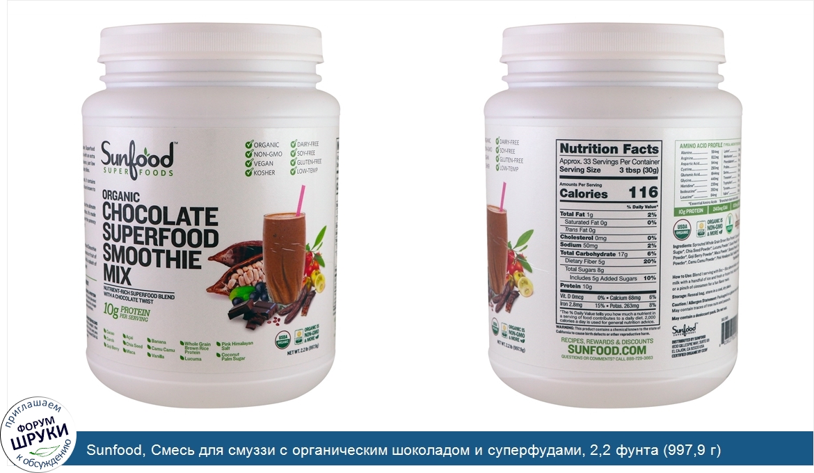 Друзья, если у вас есть отзыв/дополнение/комментарий/вопрос относительно Sunfood, Смесь для смуззи с органическим шоколадом и суперфудами, 2,2 фунта (997,9 г) - напишите его ответом в эту тему (это будет полезно всему сообществу в целом и вам в отдельности).