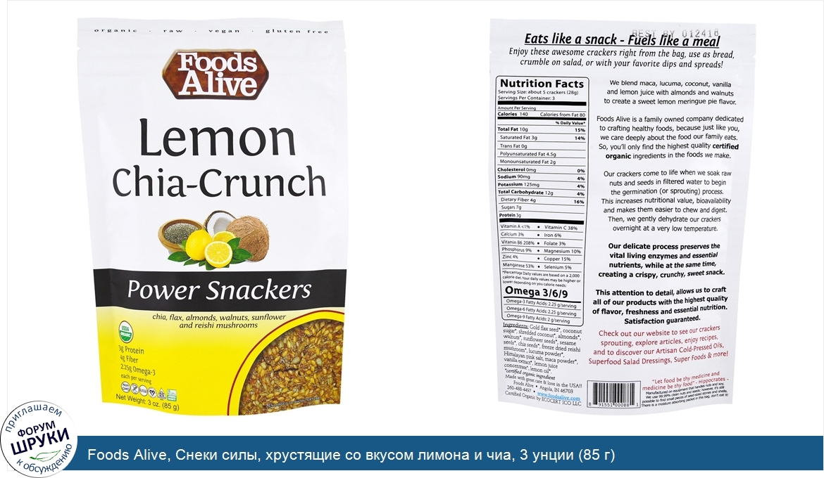 Друзья, если у вас есть отзыв/дополнение/комментарий/вопрос относительно Foods Alive, Снеки силы, хрустящие со вкусом лимона и чиа, 3 унции (85 г) - напишите его ответом в эту тему (это будет полезно всему сообществу в целом и вам в отдельности).