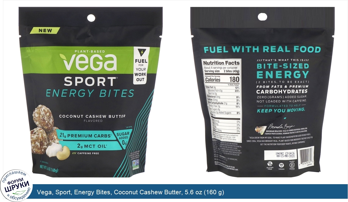 [DESCRIPT]Растительный продукт. Энергия для тренировок. 21 г углеводов премиального качества*. 2 г масла со среднецепочечными триглицеридами*. 0 г добавленного сахара*. Без кофеина. 4 порции. сертификат Non GMO Project Verified. Запас энергии и просто еда. Не содержит глютена. Сертифицированный веганский продукт. Сертификат B Corporation. /// Вот что это такое ///. Энергия в маленьком кусочке (а точнее, в 2 кусочках). Из жиров и углеводов премиального качества. Ноль (грамм) добавленного сахара. Не содержит кофеина. Предназначен для активного образа жизни. Брендан Бразье: один из основателей компании Vega и создатель формулы. Бывший профессиональный спортсмен в триатлоне Ironman и автор бестселлеров. «Компания Vega стала результатом моей цели: сделать питание растительного происхождения более доступным для занятых людей. С 2004 года компания Vega собирает настоящие ингредиенты на растительной основе вместе, чтобы создать питание, которое ваш организм захочет сам.". *В 1 порции.[/DESCRIPT]... (описание дополняется)