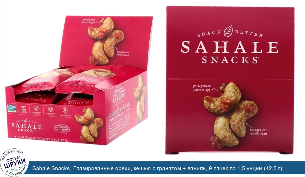Друзья, если у вас есть отзыв/дополнение/комментарий/вопрос относительно Sahale Snacks, Глазированные орехи, кешью с гранатом + ваниль, 9 пачек по 1,5 унции (42,5 г) - напишите его ответом в эту тему (это будет полезно всему сообществу в целом и вам в отдельности).