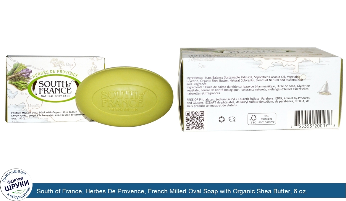 Друзья, если у вас есть отзыв/дополнение/комментарий/вопрос относительно South of France, Herbes De Provence, French Milled Oval Soap with Organic Shea Butter, 6 oz. (170 g) - напишите его ответом в эту тему (это будет полезно всему сообществу в целом и вам в отдельности).