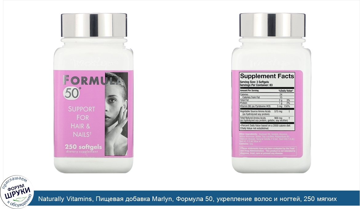 Naturally Vitamins, Пищевая добавка Marlyn, Формула 50, укрепление волос и ногтей, 250 мягких капсул