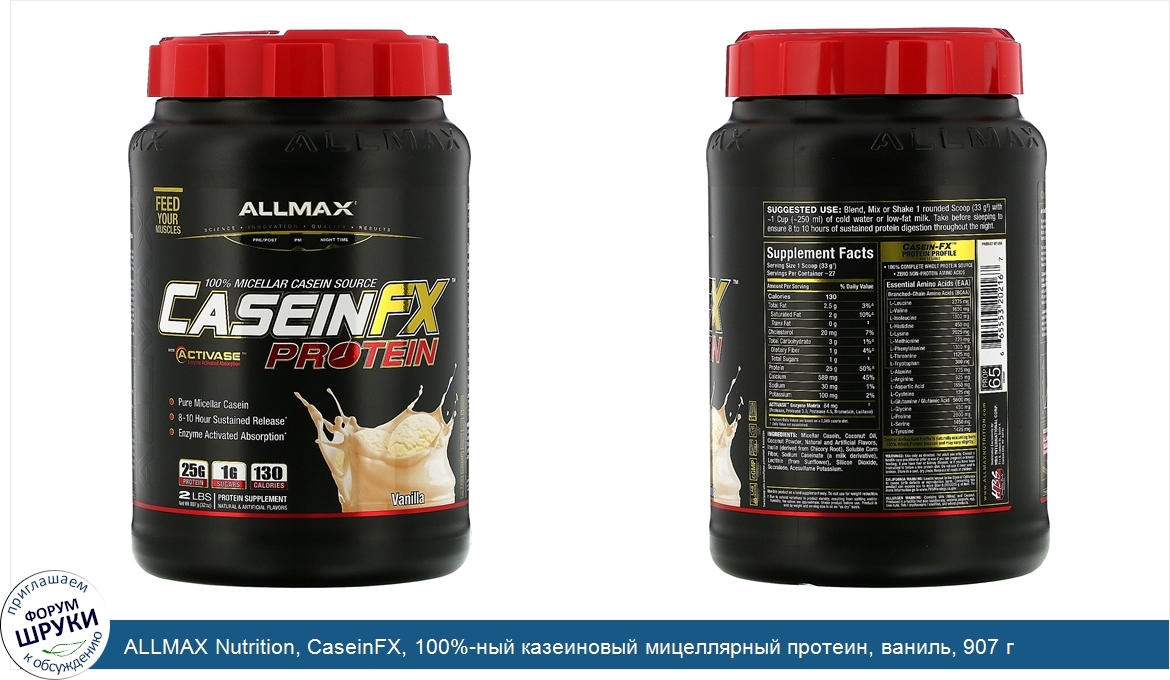 [DESCRIPT]Покормите свои мышцы. Наука - Инновации - Качество - Результаты. До/После - Во второй половине дня - Вечером. Мерная ложка с новым дизайном. Закреплена и ждет внутри. С Activase — усвоением при помощи ферментов. Чистый мицеллярный казеин. Задержка высвобождения до 8-10 часов. Усвоение, активируемое ферментами. 25 г белка. 1 г сахара. 130 калорий. 907 г — белковая добавка. Каждый ингредиент и партия проверяются в лабораторных условиях. Зарегистрированный CGMP объект производства. Не содержит глютена. Кошерный молочный продукт. 100% цельный источник белка. Натуральные и искусственные ароматизаторы. Подсластители: ацесульфам калия и сукралоза. Никогда не теряйте свою мерную ложку благодаря специальному креплению для нее. Эргономичный дизайн. Легко открывается. Каждый раз фиксируется на своем месте. Всегда у вас под рукой. Соответствует Предложению 65. Casein FX — обеспечьте питанием ваши мышцы на время сна. Не упускаете ли вы лучшую возможность нарастить мышцы? Время вашего сна — это отличное время наращивания мышц, на которое никто не обращает внимания! 8-10 часов необходимого сна — это самый длительный период времени, в течение которого вам приходится обходиться без белка. В это время вы теряете возможность продолжать наращивание мышечной массы и, что не менее важно, возможность помешать вашему организму разрушать ваши мышцы! Исследования дают ясный и решительный ответ на этот вопрос — прием 20–40 г медленно переваривающегося белка перед сном стимулирует синтез мышечных белков и ограничивает распад мышц. Мицеллярный казеин уникален. Во время пищеварения его распад замедляется, обеспечивая эффект постепенного питания в течение длительного времени. Casein-FX — не содержит никаких небелковых аминокислот. Это означает, что весь белок, который вы получаете, поступает из комплексного источника цельного белка. Casein-FX не содержит глютена, имеет сертификат кошерности и прошел лабораторное тестирование для обеспечения его чистоты, качества и эффективности, которые вы привыкли ожидать от AllMax. Благодаря почти 80%-ному выходу белка вы получаете низкоуглеводную пищу без добавления сахара, которая смещает баланс дневного потребления белка в вашу пользу. Casein-FX — это густой и вкусный белок, который содержит чистый мицеллярный казеин для обеспечения получения белка в течение 8 часов! Вы заметите, что Casein-FX становится более густым после размешивания. Он также делает вас более сытым и помогает вам избежать перекусов поздним вечером. Casein-FX — это удобное, легкое в смешивании и вкусное средство для обеспечения питания ваших мышц в течение многих часов. Activase — усвоение при помощи ферментов. Вы не можете усвоить то, что не переварили! Все белки состоят из аминокислот. Ваш организм не может усвоить белок, не расщепив его на более мелкие частицы — аминокислоты. Вот здесь то Casein-FX переводит дополнительное питание на следующий уровень. Activase содержит 4 уникальных вида ферментов для переваривания белка, которые действуют по отдельности на различных стадиях пищеварения, позволяя извлекать почти в 4 раза больше перевариваемых аминокислот из белка! Кроме того, мы добавили в данное соединение лактазу — фермент, который помогает усваивать лактозу и предотвращает вздутие живота, газообразование и расстройство желудка, которое может произойти при использовании других белк
