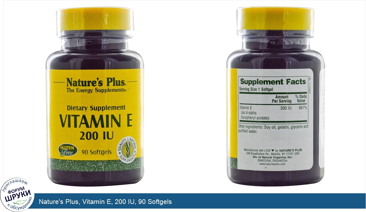 The Energy Supplements. Dietary Supplement. Gluten Free. Quality Natural Supplements. Nutritional support for free-radical defense. Nature's Plus Vitamin E easy-to-swallow softgels are derived from natural soybea...