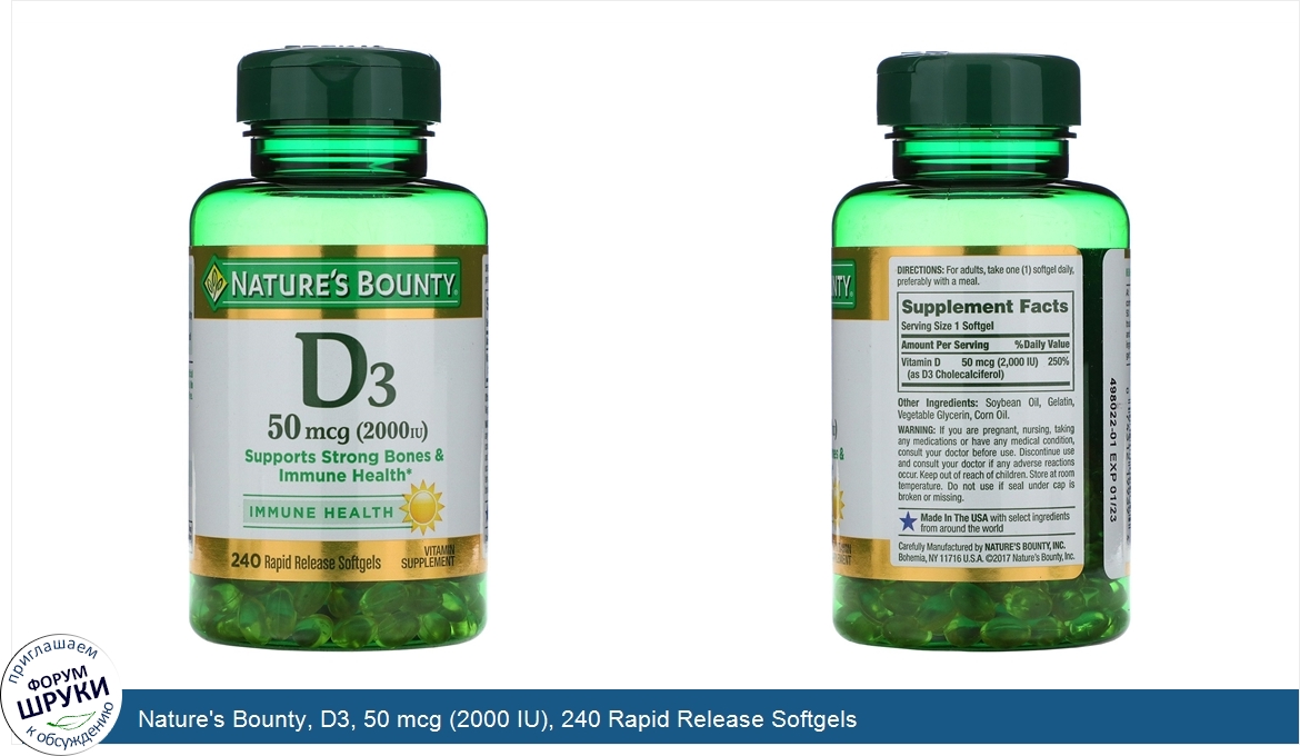 Друзья, если у вас есть отзыв/дополнение/комментарий/вопрос относительно Nature's Bounty, D3, 50 mcg (2000 IU), 240 Rapid Release Softgels - напишите его ответом в эту тему (это будет полезно всему сообществу в целом и вам в отдельности).