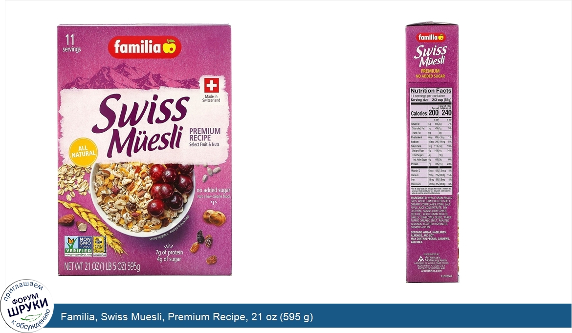 [DESCRIPT]All Natural. Select Fruits Nuts. No Added Sugar. Not a Low Calorie Food. Non GMO Project Verified. 36 g or More Per Serving - 50% or More of the Grain is Whole Grain. 7 g of Protein. 4 g of Sugar. No Added Sugar. Premium Style. No Artificial Colors, Flavors, Sweeteners. Whole Grains. Plant-Based. Familia The Story of Bircher Mu. ë. sli. Situated in the heart of Switzerland – on the bank of the lake of Sarnen, surrounded by a magnificently idyllic landscape of mountains – bio-familia produces the authentic Swiss Muesli. In 1959, in agreement with the descendants of the Birchermüesli-Inventor Dr. Maximilian Bircher-Benner, bio-familia produced the first Birchemüeslii worldwide. As the pioneer maker of traditional Swiss Müesli bio-familia is proud to continue this tradition of bringing the world wholesome and unique cereal goodness grown in harmony and balance with the land. Swiss Müesli Premium. Swiss Müesli Premium Recipe is made with simple, whole grain ingredients. The unique blend of whole grain rolled oats, spelt, barley and cornflakes provides lasting satiety and requires less soaking than traditional Muesli. We’ve added select fruit, nuts and seeds to provide you with long-lasting energy. With no sugar added, Swiss Müesli Premium Recipe is the perfect guilt free breakfast or light meal. #1 Taste-test bowl after bowl of Müesli every day in our lab. Our top priorities? flawless quality and taste. Rita, collaborator in the Müesli lab at bio-familia since 1989.[/DESCRIPT]... (описание дополняется)