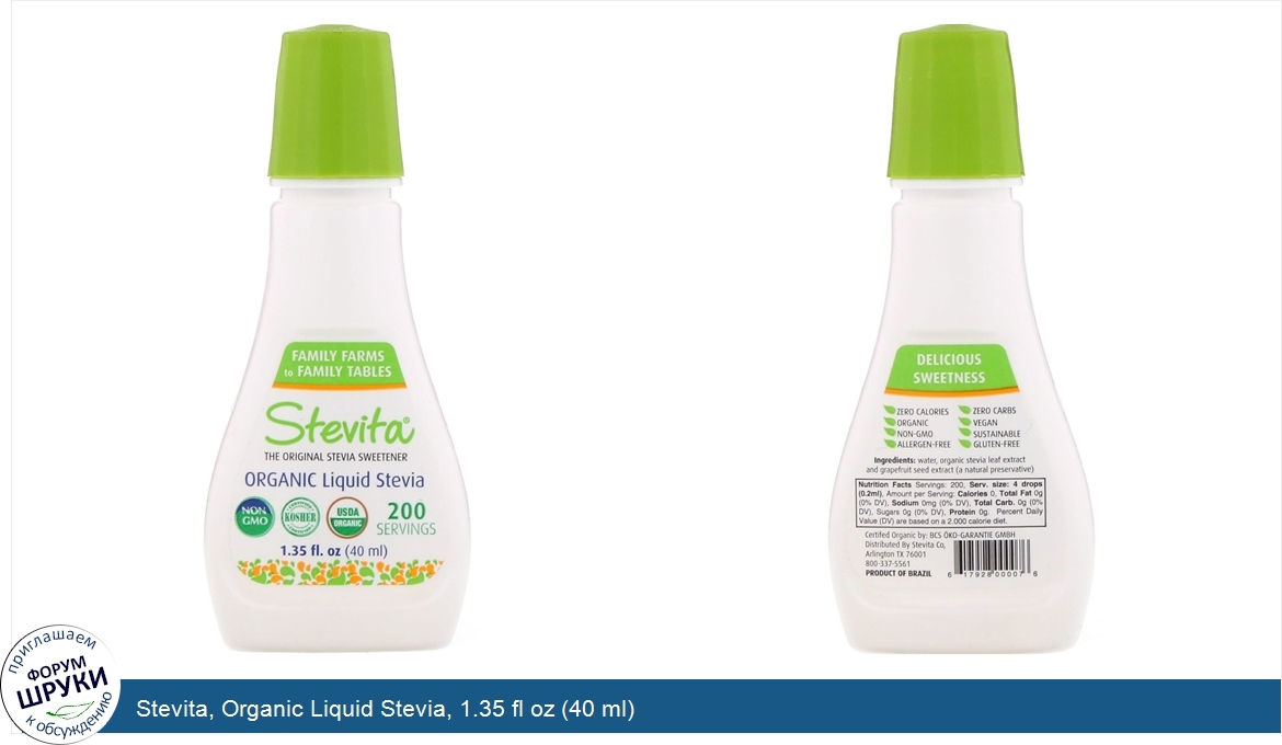 Друзья, если у вас есть отзыв/дополнение/комментарий/вопрос относительно Stevita, Organic Liquid Stevia, 1.35 fl oz (40 ml) - напишите его ответом в эту тему (это будет полезно всему сообществу в целом и вам в отдельности).