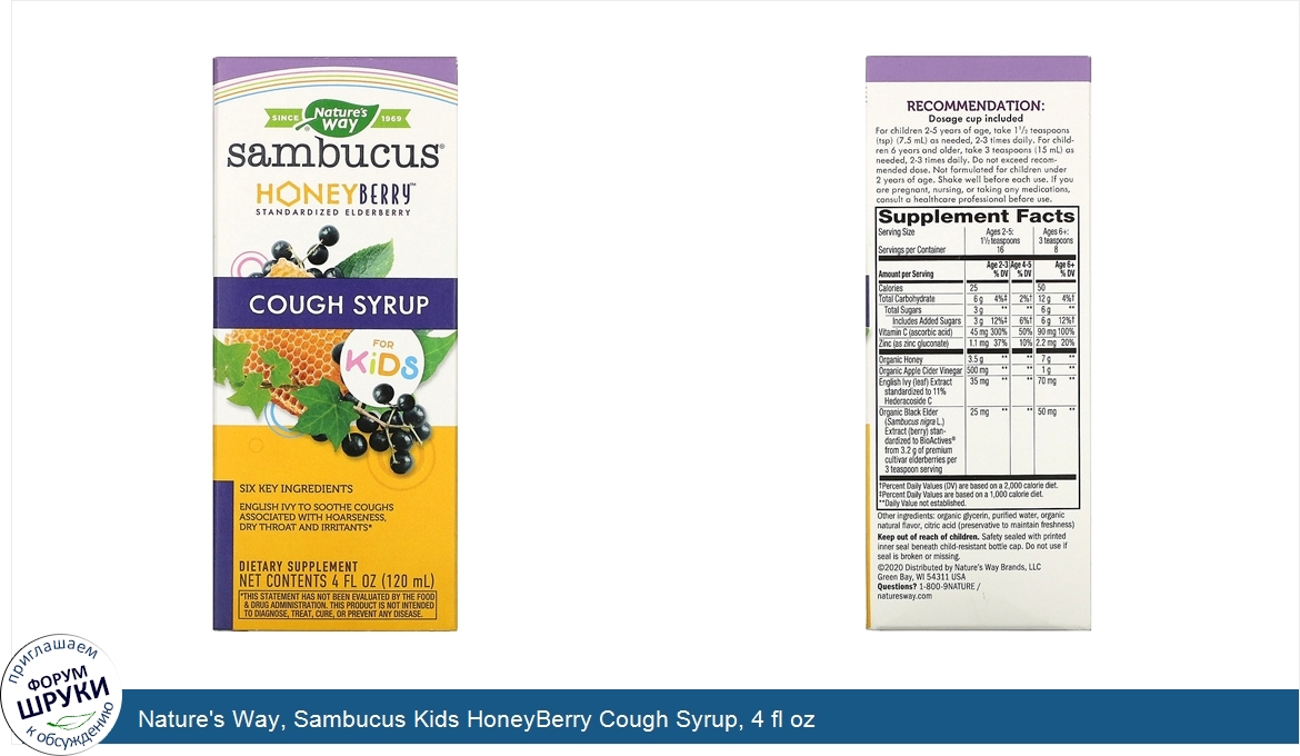 [DESCRIPT]This delicious cough syrup, formulated just for kids, features six key ingredients: organic standardized elderberry extract, organic honey, organic apple cider vinegar, vitamin C, zinc, and English ivy leaf extract.* English Ivy Leaf extract helps to soothe coughs associated with hoarseness, dry throat, and irritants.* If your family loves Nature�s Way Sambucus syrups, they�ll definitely love the soothing benefits of HoneyBerry Cough Syrup for Kids.[/DESCRIPT]... (описание дополняется)