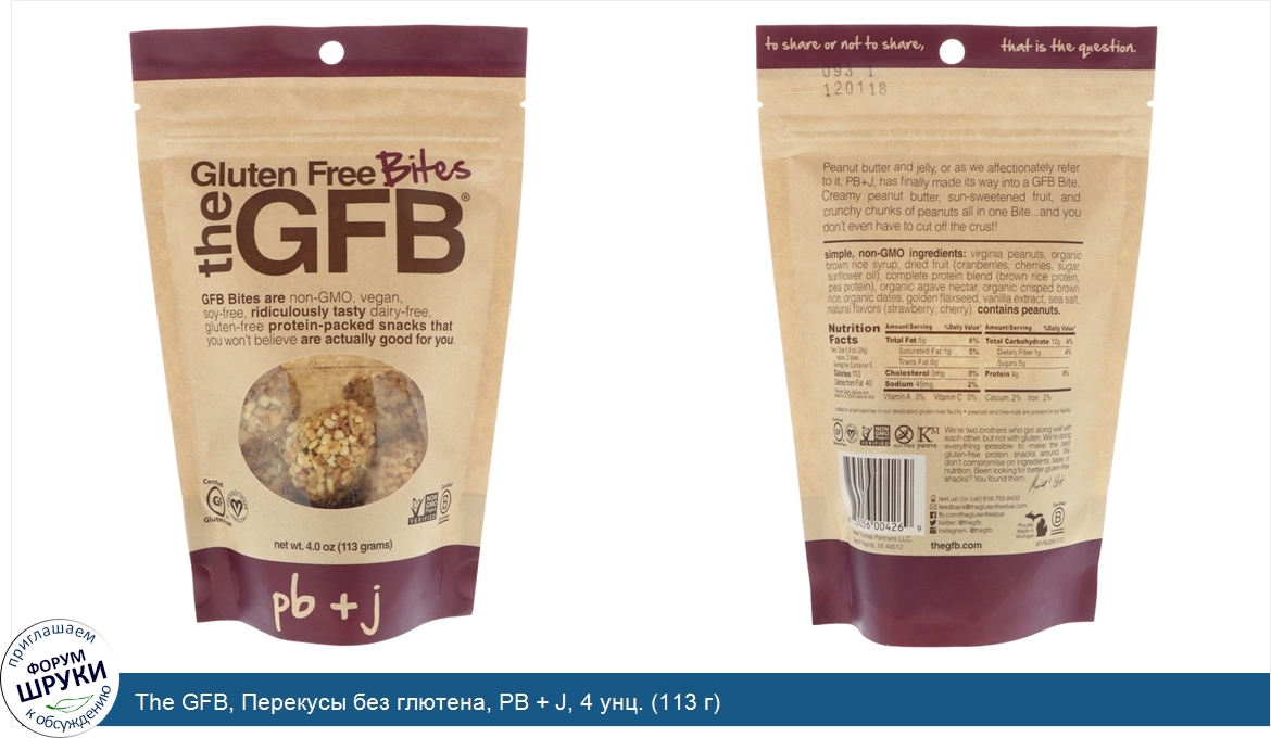 Друзья, если у вас есть отзыв/дополнение/комментарий/вопрос относительно The GFB, Перекусы без глютена, PB + J, 4 унц. (113 г) - напишите его ответом в эту тему (это будет полезно всему сообществу в целом и вам в отдельности).