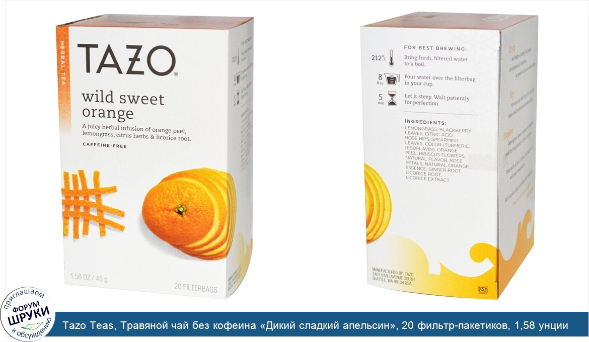 Друзья, если у вас есть отзыв/дополнение/комментарий/вопрос относительно Tazo Teas, Травяной чай без кофеина «Дикий сладкий апельсин», 20 фильтр-пакетиков, 1,58 унции (45 г) - напишите его ответом в эту тему (это будет полезно всему сообществу в целом и вам в отдельности).