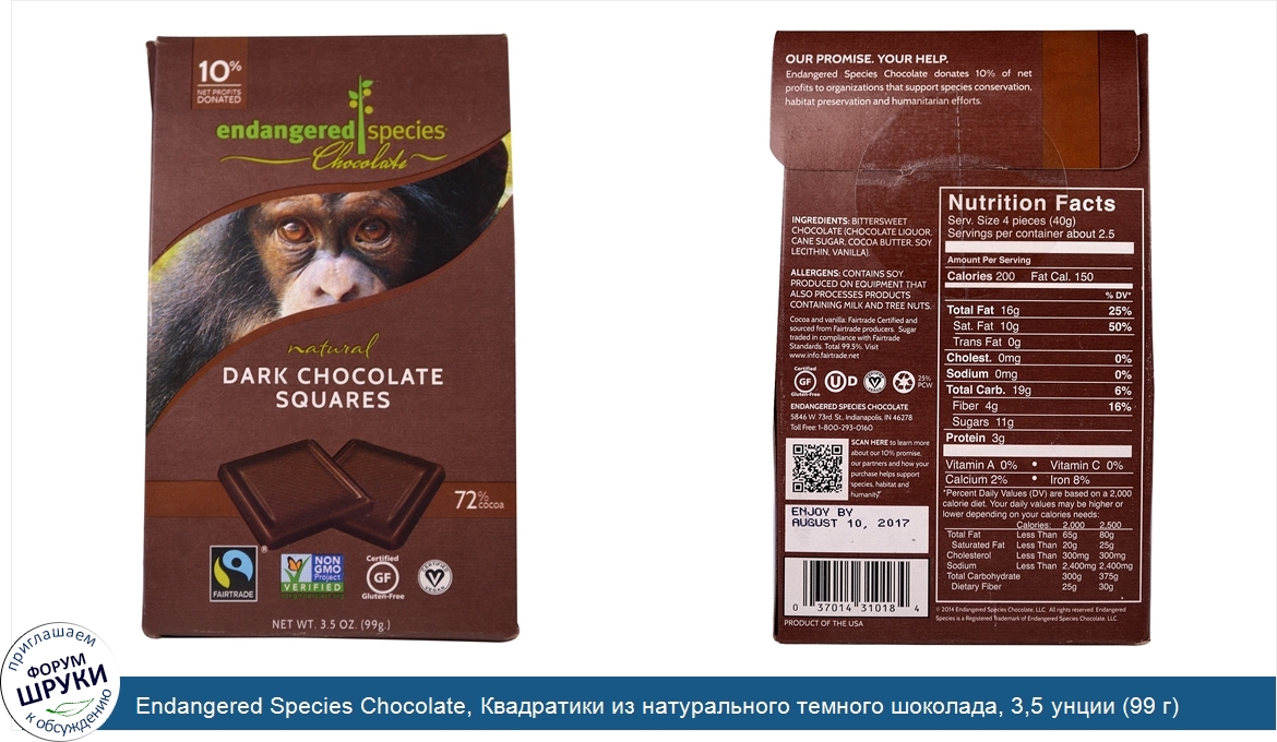 Друзья, если у вас есть отзыв/дополнение/комментарий/вопрос относительно Endangered Species Chocolate, Квадратики из натурального темного шоколада, 3,5 унции (99 г) - напишите его ответом в эту тему (это будет полезно всему сообществу в целом и вам в отдельности).