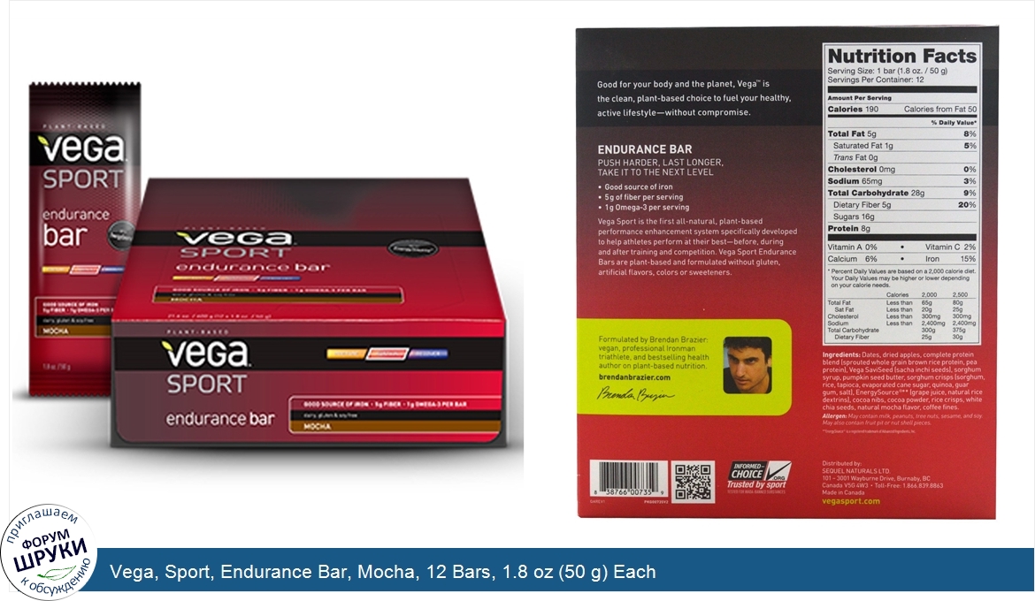 [DESCRIPT]Plant-Based. With EnergySource. Prepare -. Sustain. - Recover. Good Source of Iron. 5 g of Fiber. 1 g Omega-3 Per Bar. Gluten Free. Informed Choice.org, Trusted by Sport - Tested for WADA-Banned Substances. Good for your body and the planet, Vega is the clean, planet-based choice to fuel your healthy, active lifestyle—without compromise. Push Harder, Last Longer, Take it to the Next Level. Good source of iron. 5 g of fiber per serving. 1 g Omega-3 per serving. Vega Sport is the first all-natural, plant-based performance enhancement system specifically developed to help athletes perform at their best—before, during and after training and competition. Formulated by Brendan Brazier: vegan, professional Ironman triathlete, and best-selling health author on plant-based nutrition.[/DESCRIPT]... (описание дополняется)