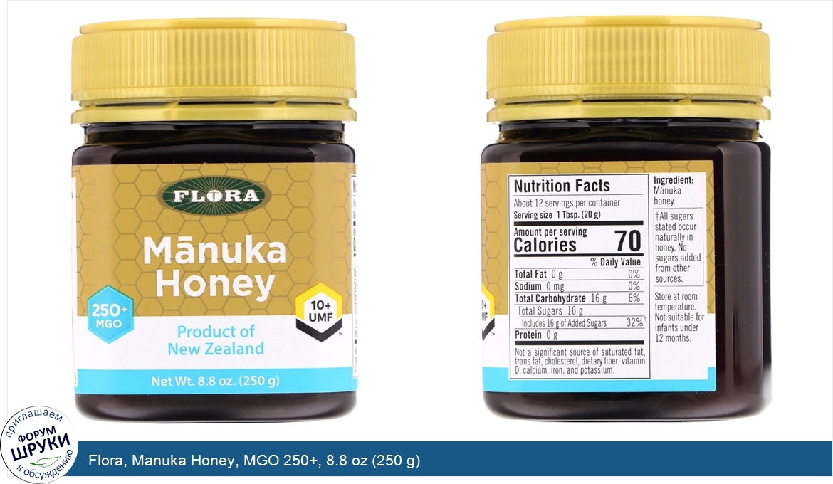 Друзья, если у вас есть отзыв/дополнение/комментарий/вопрос относительно Flora, Manuka Honey, MGO 250+, 8.8 oz (250 g) - напишите его ответом в эту тему (это будет полезно всему сообществу в целом и вам в отдельности).
