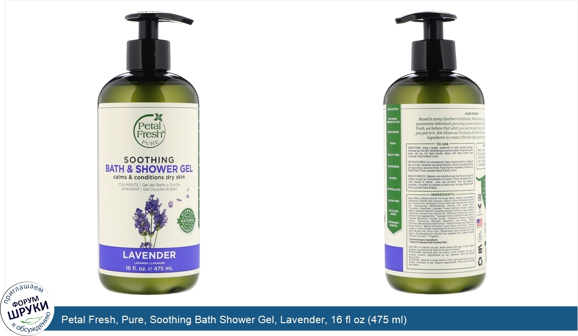 [DESCRIPT]Calms Conditions Dry Skin. Made With Blend Of Natural Botanicals. No Sulfates. No Harsh Preservatives. pH Balanced. Vegan. Cruelty-Free . No Parabens. No GMOs. No Phthalates. Gluten-Free. No Colors Added. Sustainably Sourced. We Love Animals. Our Story. Based in sunny Southern California, Petal Fresh was started by a group of passionate individuals pursuing a more natural and healthy lifestyle. At Petal Fresh, we believe that what you put on your body is just as important as what you put in it. We infuse our formulas with the most natural, Certified Organic ingredients to create effective high-quality products, naturally. Lavender Bath and Shower Gel. Wash your worries away with Petal Fresh® Pure Lavender Bath Shower Gel. Calming Certified Organic Lavender soothes senses and diminishes stress to deliver an incredibly calming shower experience. The use of Lavender in aromatherapy and beauty does back thousands of years. Renowned for its abilities to calm and relax, Lavender is not only wonderful for soothing the mind, but also ideal for nourishing dry or sensitive skin.[/DESCRIPT]... (описание дополняется)