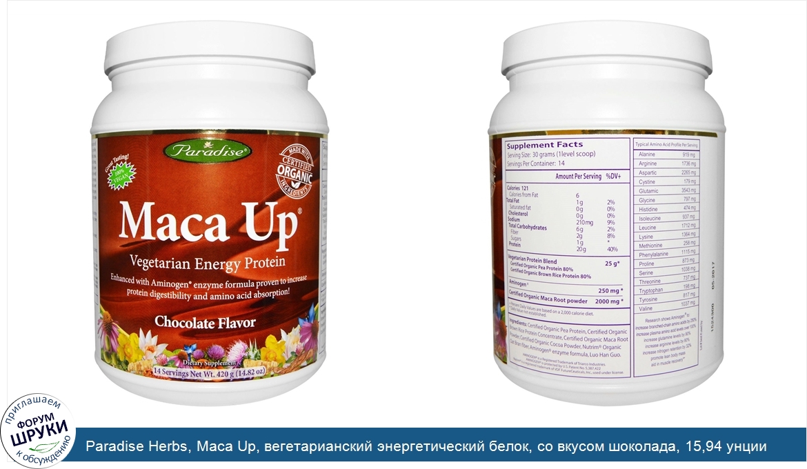[DESCRIPT]Великолепный вкус! . 100% веганский. Пищевая добавка. 14 порций. Совершенствуя чудеса природы с 1994 года. Улучшено формулой с ферментом Аминоген, который увеличивает усвояемость белка и поглощение аминокислот! Вегетарианский энергетический белок Maca Up от Paradise - это полноценный источник веганского, гипоаллергенного белка со сбалансированным профилем аминокислот, полученных из не содержащего ГМО коричневого риса и не содержащего ГМО европейского желтого гороха. Усвояемость нашего горохового белка составила 97,6%, а также было выявлено, что он обладает устойчивым временем высвобождения около 8 часов, что означает, что он имеет отличную усвояемость и продолжает действовать после приема. Мы усилили нашу формулу, добавив в нее фермент Аминоген растительного происхождения. Исследования показывают, что Аминоген повышает уровень аминокислот с разветвленной цепью на 250%, уровень аминокислот в плазме на более, чем 100%, уровень глютамина на 90%, уровень аргинина на 80% и уровень удержания азота на 32%. Он также способствует повышению мышечной массы, восстановлению мышц и сокращению газообразования, вздутия живота и запоров. Maca Up от Paradise также содержит хороший источник клетчатки для здорового сердца из органических овсяных отрубей Nutrim. Мака использовалась на протяжении веков народами Перу из-за ее удивительных качеств, повышающих энергию и выносливость.[/DESCRIPT]... (описание дополняется)