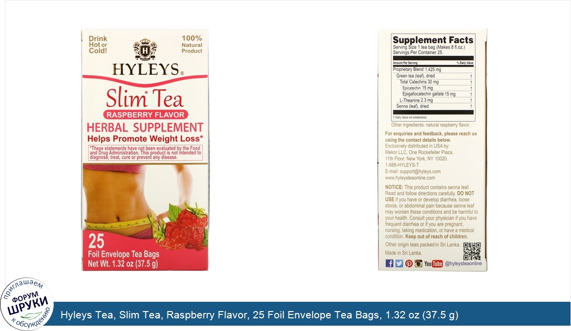 ru Hyleys Tea, Slim Tea, Raspberry Flavor, 25 Foil Envelope Tea Bags, 1.32 oz (37.5 g)