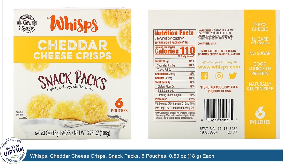 Друзья, если у вас есть отзыв/дополнение/комментарий/вопрос относительно Whisps, Cheddar Cheese Crisps, Snack Packs, 6 Pouches, 0.63 oz (18 g) Each - напишите его ответом в эту тему (это будет полезно всему сообществу в целом и вам в отдельности).