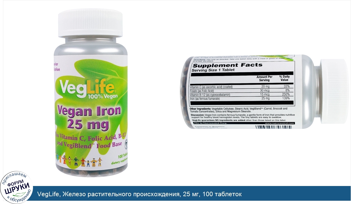 VegLife, Железо растительного происхождения, 25 мг, 100 таблеток