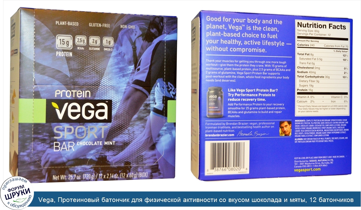 [DESCRIPT]На растительной основе. Не содержит глютен. Без ГМО. 15 г белка. 2,5 г аминокислот с разветвленной цепью. 2 г глутамина. 1 г Омега-3. Подготовка - Поддержка -. Восстановление. Новый вкус. Протеиновый батончик для физической активности со вкусом шоколада и мяты Vega. 15 грамм белка, полученного из разнообразных растительных источников. 1 грамм Омега-3 из масла SaviSeed. В каждом батончике содержатся цельные продукты. Vega Sport – это единственная полноценная, растительная система улучшения спортивной производительности, специально разработанная для спортсменов, чтобы они могли показать лучший результат до, во время и после тренировки и на соревнованиях. Vega не наносит вреда вашему организму и планете, этот чистый растительный продукт заряжает ваш организм энергией, чтобы вы могли вести активный образ жизни и вам не приходилось идти на компромисс. Поблагодарите ваши мышцы за очередную усердную тренировку — наградите их необходимым количеством белка. Протеиновый батончик для физической активности Vega содержит 15 грамм белка, полученного из разнообразных растительных источников, 2,5 грамма BCAA и 2 грамма глутамина и с помощью натуральных, цельных питательных ингредиентов обеспечивает необходимую (и заслуженную) поддержку организма после тренировки. Vega создана Брендоном Брейзером, вегетарианцем, профессиональным триатлонистом и автором бестселлеров по правильному вегетарианскому питанию.[/DESCRIPT]... (описание дополняется)