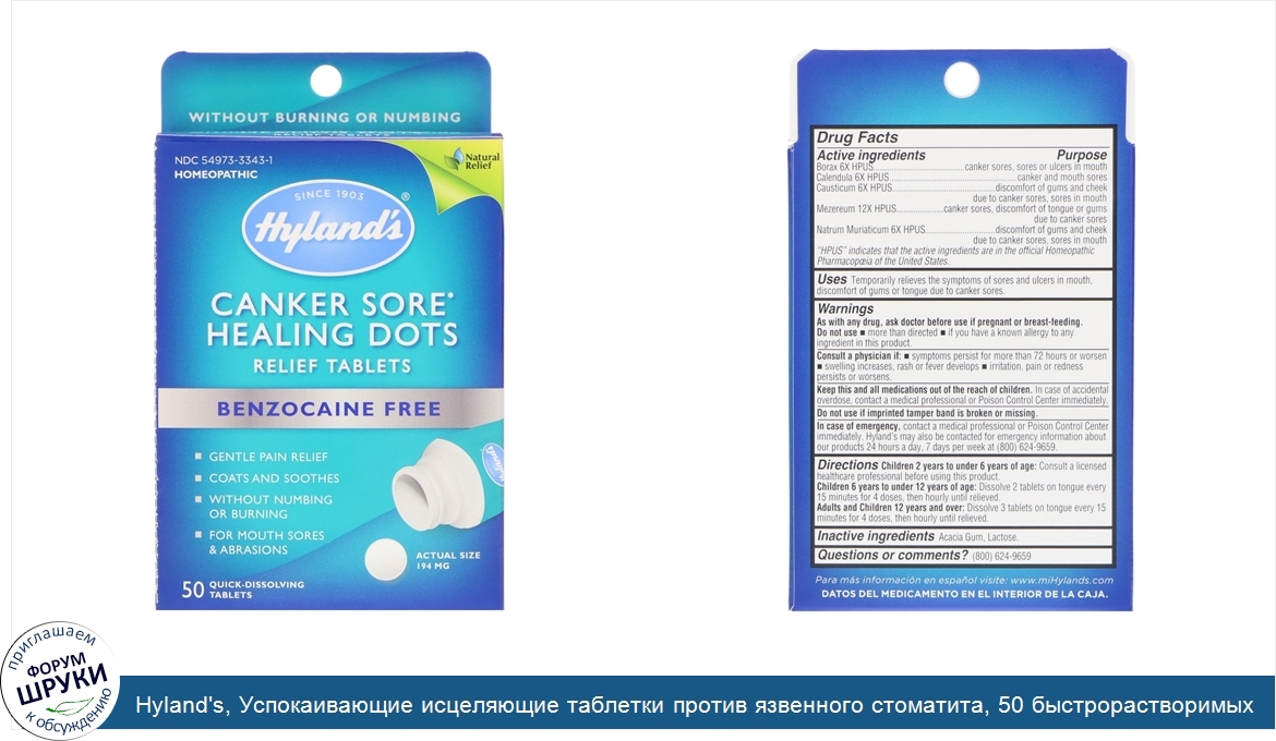 Друзья, если у вас есть отзыв/дополнение/комментарий/вопрос относительно Hyland's, Успокаивающие исцеляющие таблетки против язвенного стоматита, 50 быстрорастворимых таблеток - напишите его ответом в эту тему (это будет полезно всему сообществу в целом и вам в отдельности).