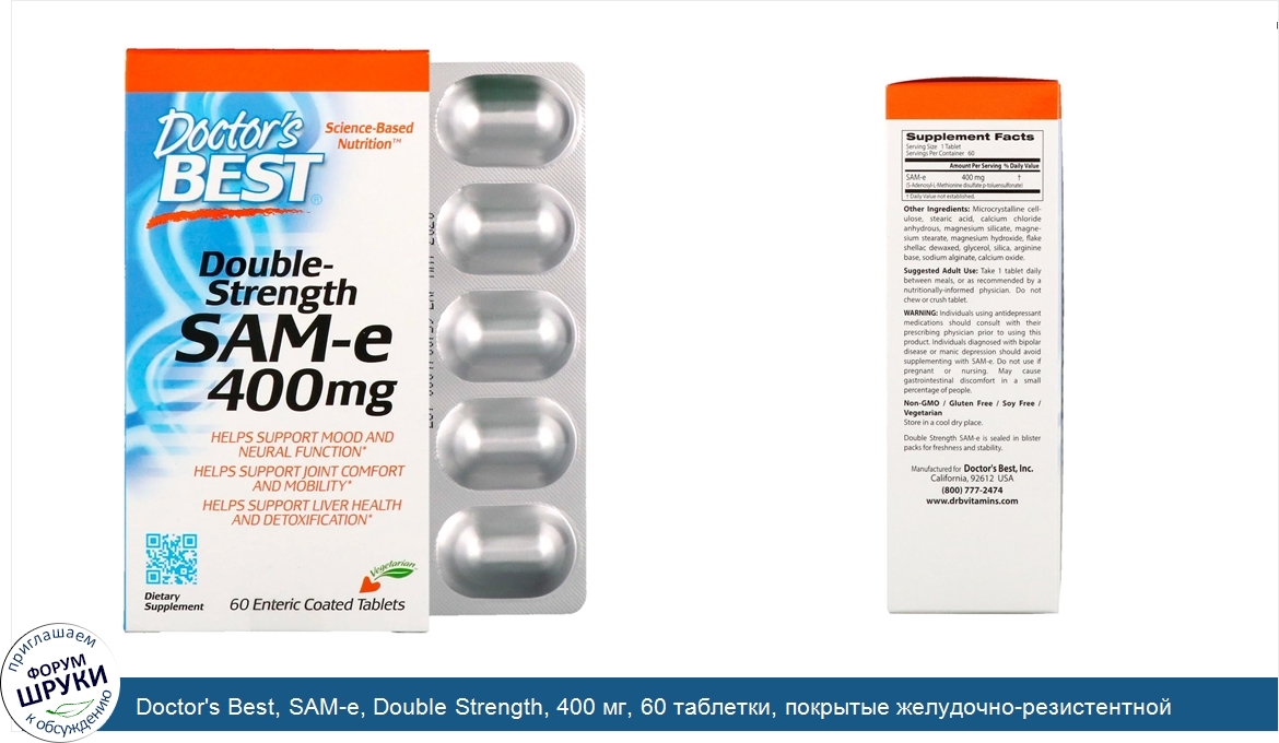 Друзья, если у вас есть отзыв/дополнение/комментарий/вопрос относительно Doctor's Best, SAM-e, Double Strength, 400 мг, 60 таблетки, покрытые желудочно-резистентной оболочкой - напишите его ответом в эту тему (это будет полезно всему сообществу в целом и вам в отдельности).