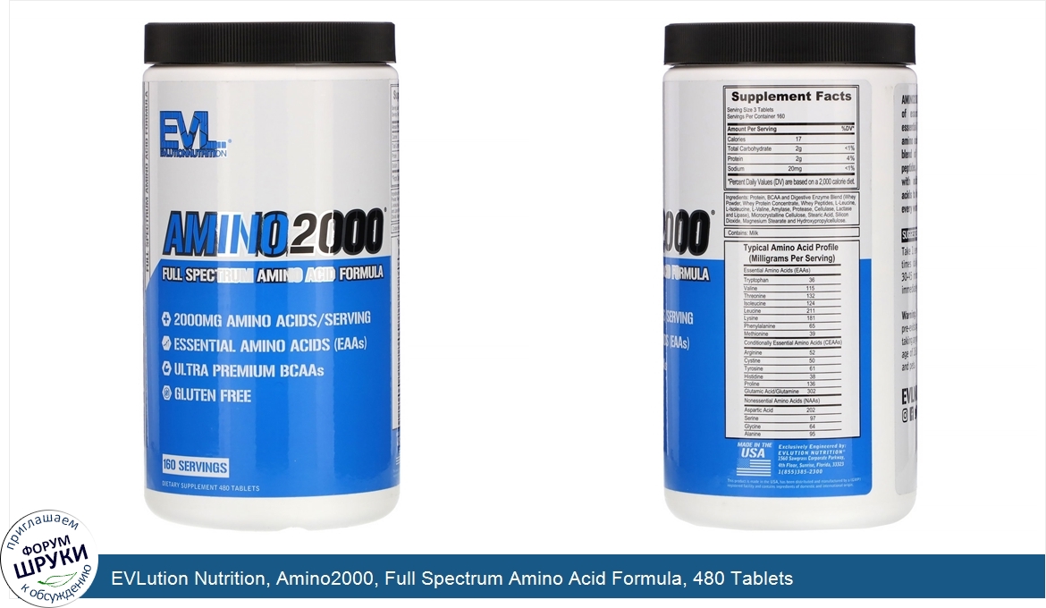 Друзья, если у вас есть отзыв/дополнение/комментарий/вопрос относительно EVLution Nutrition, Amino2000, Full Spectrum Amino Acid Formula, 480 Tablets - напишите его ответом в эту тему (это будет полезно всему сообществу в целом и вам в отдельности).