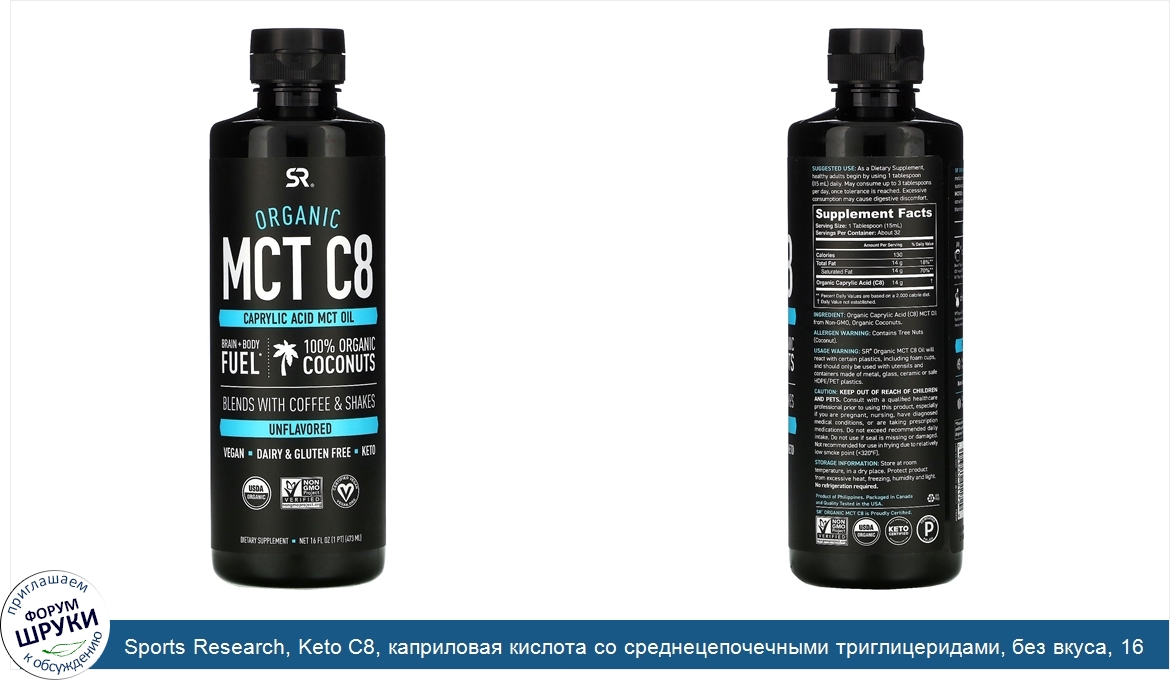 [DESCRIPT]Caprylic Acid MCT Oil. Brain + Body Fuel. 100% Organic Coconuts. Blends with Coffee Shakes. Dairy Gluten Free. Keto. USDA Organic. NON GMO Project Verified. Certified Vegan. Dietary Supplement. Certified Organic by QAI, Inc. SR® Organic MCT C8 Oil is a keto-supportive, medium chain fatty acid extracted exclusively from sustainably sourced coconuts. SR® Organic MCT C8 is quickly digested, absorbed and converted into ketone bodies more efficiently than traditional MCTs or coconut oils. Premium Keto Fuel. Supports Ketone Body Production for Jitter-Free Energy. Keto Low-Carb Lifestyle Friendly. Carbohydrate Free Fuel for the Brain Body.[/DESCRIPT]... (описание дополняется)