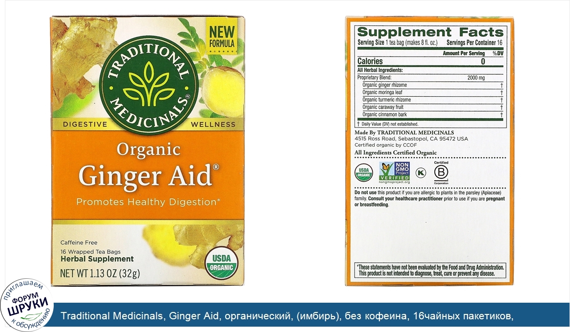 Traditional Medicinals, Ginger Aid, органический, (имбирь), без кофеина, 16чайных пакетиков, 32г (1,13унции)