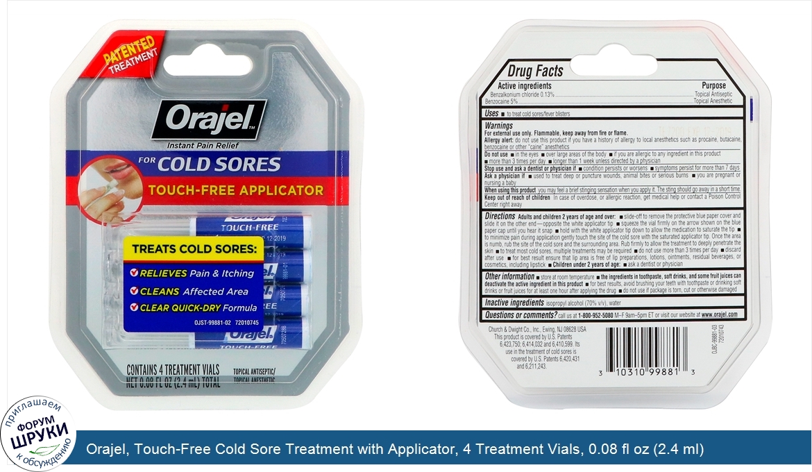 Друзья, если у вас есть отзыв/дополнение/комментарий/вопрос относительно Orajel, Touch-Free Cold Sore Treatment with Applicator, 4 Treatment Vials, 0.08 fl oz (2.4 ml) - напишите его ответом в эту тему (это будет полезно всему сообществу в целом и вам в отдельности).