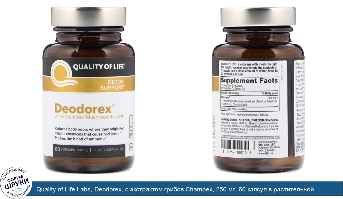 Quality of Life Labs, Deodorex, с экстрактом грибов Champex, 250 мг, 60 капсул в растительной оболочке
