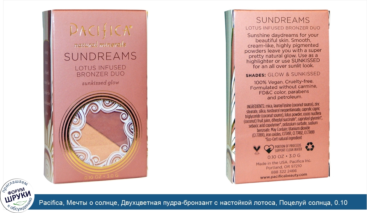 Друзья, если у вас есть отзыв/дополнение/комментарий/вопрос относительно Pacifica, Мечты о солнце, Двухцветная пудра-бронзант с настойкой лотоса, Поцелуй солнца, 0.10 унции (3.0 г) - напишите его ответом в эту тему (это будет полезно всему сообществу в целом и вам в отдельности).