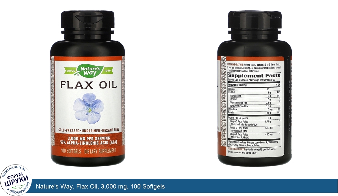 Since 1969. Cold-Pressed. Unrefined. Hexane Free. 3,000 mg Per Serving. 57% Alpha-Linoleic Acid (ALA). Dietary Supplement. Nature's Way®. Flax Oil is the highest quality oil - guaranteed to contain 57% alpha-lino...