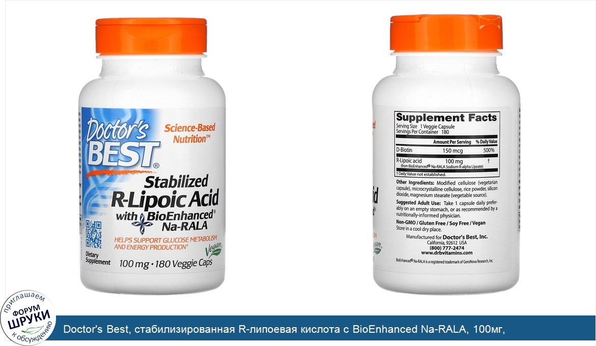 Друзья, если у вас есть отзыв/дополнение/комментарий/вопрос относительно Doctor's Best, стабилизированная R-липоевая кислота с BioEnhanced Na-RALA, 100мг, 180вегетарианских капсул - напишите его ответом в эту тему (это будет полезно всему сообществу в целом и вам в отдельности).