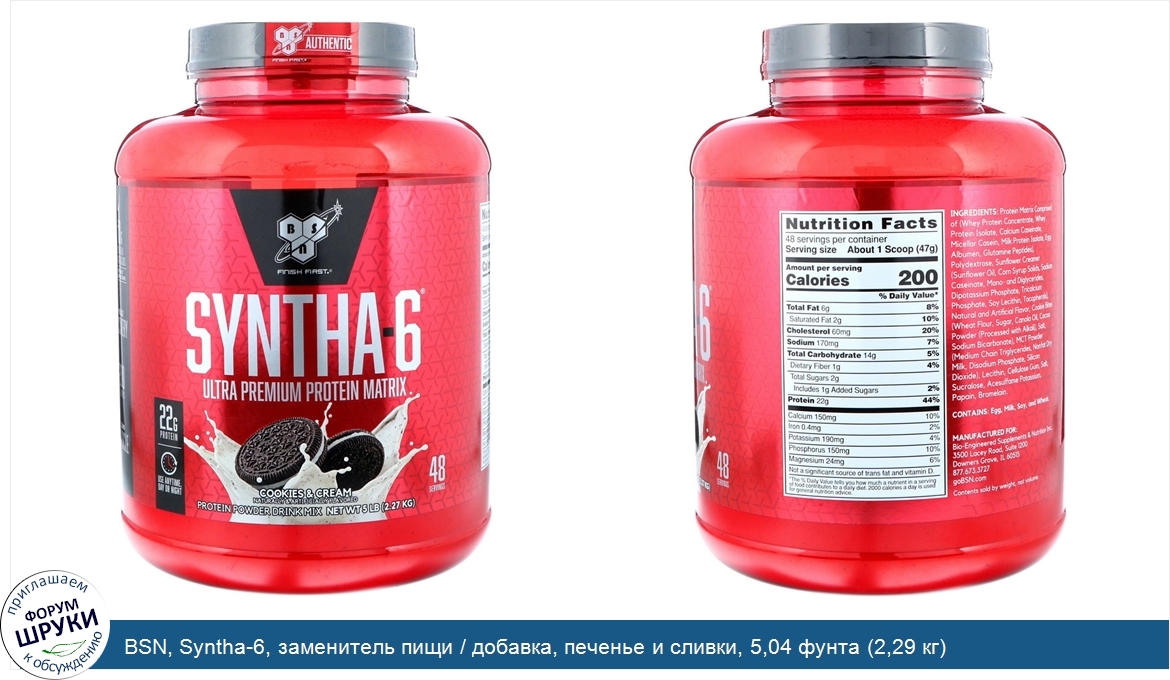 Друзья, если у вас есть отзыв/дополнение/комментарий/вопрос относительно BSN, Syntha-6, заменитель пищи / добавка, печенье и сливки, 5,04 фунта (2,29 кг) - напишите его ответом в эту тему (это будет полезно всему сообществу в целом и вам в отдельности).
