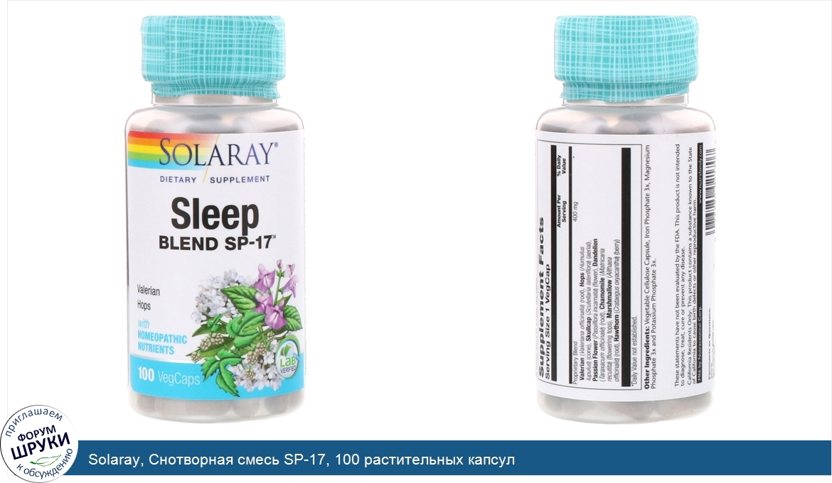 Друзья, если у вас есть отзыв/дополнение/комментарий/вопрос относительно Solaray, Снотворная смесь SP-17, 100 растительных капсул - напишите его ответом в эту тему (это будет полезно всему сообществу в целом и вам в отдельности).