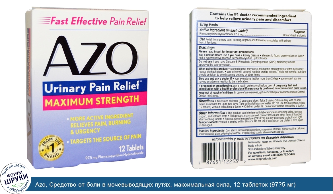 Друзья, если у вас есть отзыв/дополнение/комментарий/вопрос относительно Azo, Средство от боли в мочевыводящих путях, максимальная сила, 12 таблеток (97?5 мг) - напишите его ответом в эту тему (это будет полезно всему сообществу в целом и вам в отдельности).