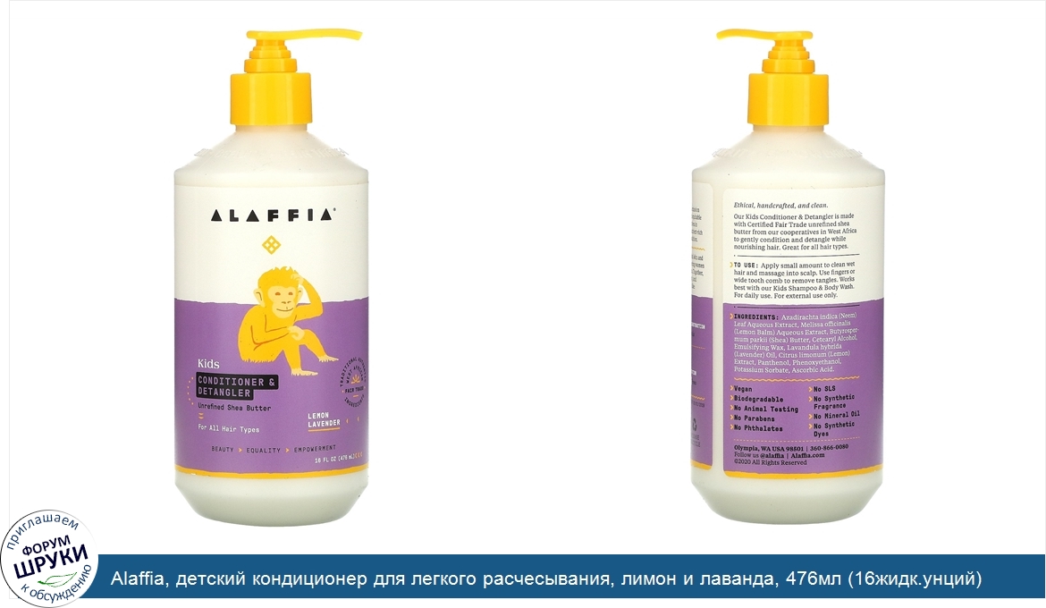 Друзья, если у вас есть отзыв/дополнение/комментарий/вопрос относительно Alaffia, детский кондиционер для легкого расчесывания, лимон и лаванда, 476мл (16жидк.унций) - напишите его ответом в эту тему (это будет полезно всему сообществу в целом и вам в отдельности).