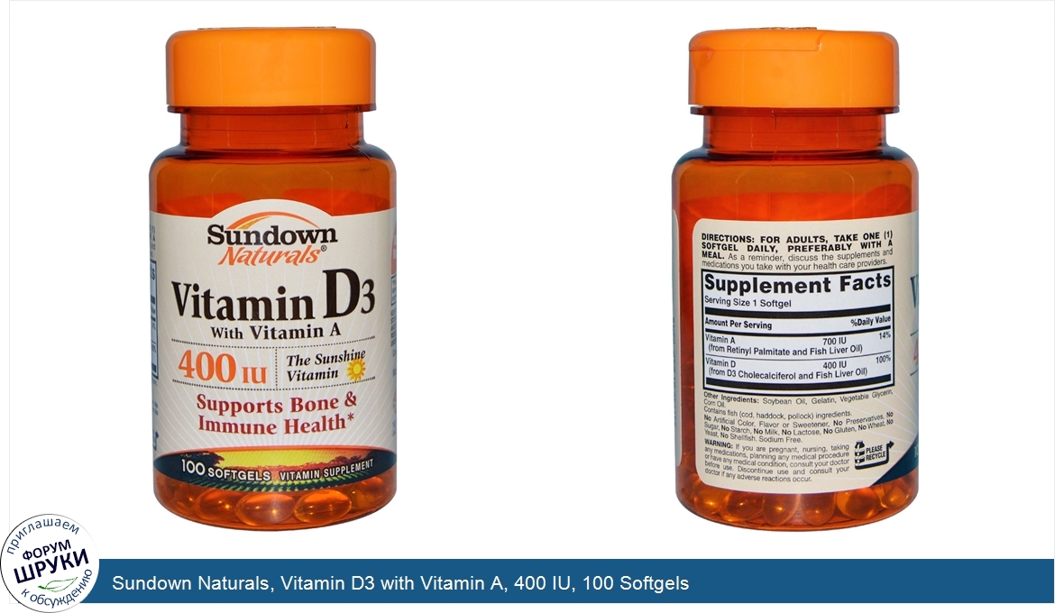 Друзья, если у вас есть отзыв/дополнение/комментарий/вопрос относительно Sundown Naturals, Vitamin D3 with Vitamin A, 400 IU, 100 Softgels - напишите его ответом в эту тему (это будет полезно всему сообществу в целом и вам в отдельности).