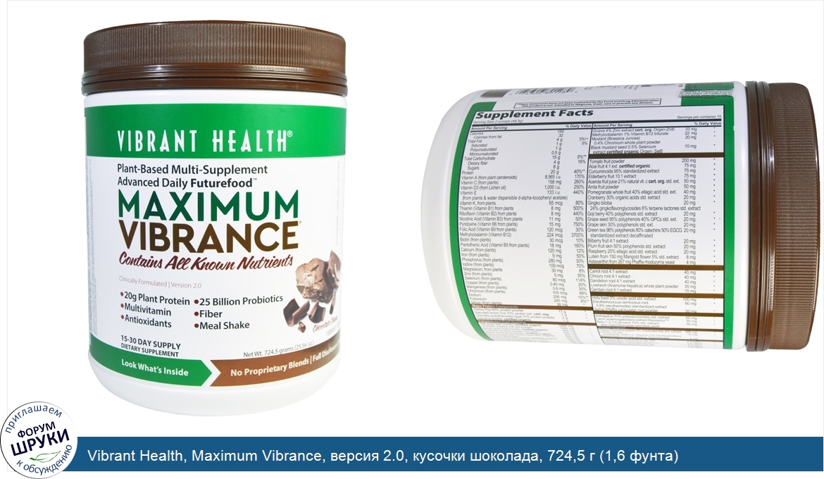 Друзья, если у вас есть отзыв/дополнение/комментарий/вопрос относительно Vibrant Health, Maximum Vibrance, версия 2.0, кусочки шоколада, 724,5 г (1,6 фунта) - напишите его ответом в эту тему (это будет полезно всему сообществу в целом и вам в отдельности).