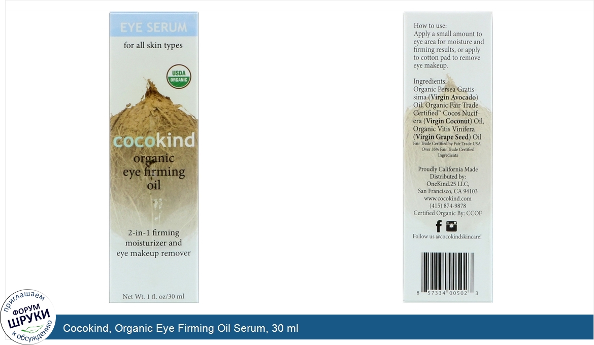 [DESCRIPT]Eye Serum. For All Skin Types. USDA Organic. 2-in-1 Moisturizer and Eye Makeup Remover. Certified Organic by: CCOF. What's in it? Organic virgin coconut oil provides deep moisture, lauric acid, and medium chain fatty acids to skin. Organic virgin avocado oil nourishes skin through its high sterolin, antioxidant and protein content. Organic virgin grape seed oil has astringent properties, assisting in the tightening and toning of skin. Our Mission. USDA Organic. Fair Trade Certified Coconut. Certified Vegan. Certified CCOF Organic Non-GMO More. Here at cocokind, wer are passionate about introducing nature's most powerful superfoods into your skincare routine. Ethically sourcing these food-grade ingredients, we believe our products should benefit your skin and the farmer who first plant the seeds. Made in San Francisco, this product is USDA certified organic, fair-trade, and vegan. This product is also:. Paraben-free. Preservative-free. Chemical-free. Gluten-free. Alcohol-free. GMO-free. Fragrance-free. Cruelty-free. Thank you for supporting our mission.[/DESCRIPT]... (описание дополняется)