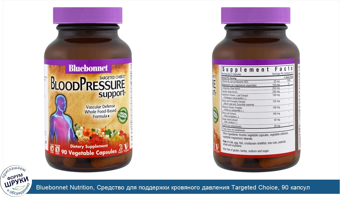 [DESCRIPT]Vascular Defense Whole Food-Based Formula. Made with Non GMO Ingredients. Dietary Supplement. Soy Free. Gluten Free. K-Parve. Vegan. Kaneka Q10. OPtain120. Bluebonnet's Targeted Choice Blood Pressure Support Capsules contain a unique blend of sustainably harvested or wildcrafted herbal/botanical extracts, the amino acids, arginine and taurine, plus grape seed extract and CoQ10 to help maintain healthy blood pressure levels that are already within the normal range. Available in easy-to-swallow vegetable capsules for maximum assimilation and absorption.[/DESCRIPT]... (описание дополняется)