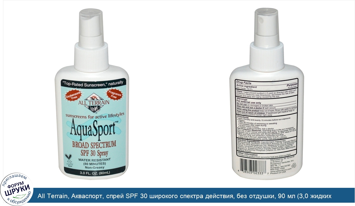 All Terrain, Акваспорт, спрей SPF 30 широкого спектра действия, без отдушки, 90 мл (3,0 жидких унций)