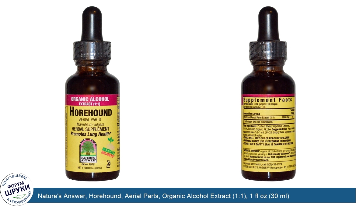 Друзья, если у вас есть отзыв/дополнение/комментарий/вопрос относительно Nature's Answer, Horehound, Aerial Parts, Organic Alcohol Extract (1:1), 1 fl oz (30 ml) - напишите его ответом в эту тему (это будет полезно всему сообществу в целом и вам в отдельности).