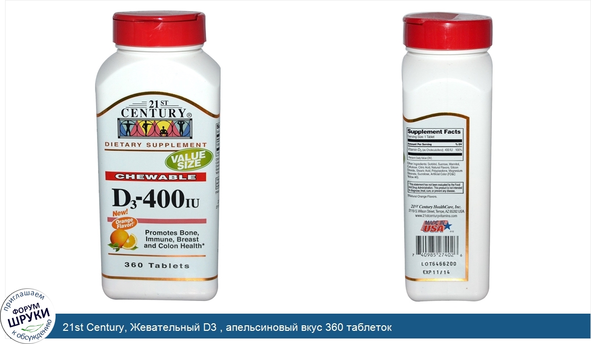 21st Century, Жевательный D3 , апельсиновый вкус 360 таблеток