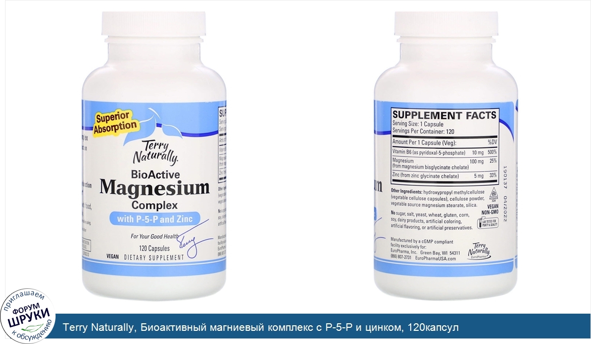 Terry Naturally, Биоактивный магниевый комплекс с P-5-P и цинком, 120капсул